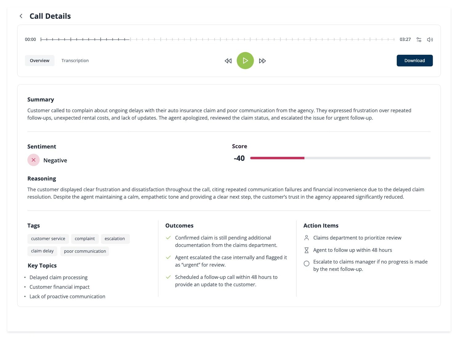 Each call is automatically tagged with topics, intent, and follow-up actions—making it easy to track trends and prioritize next steps.